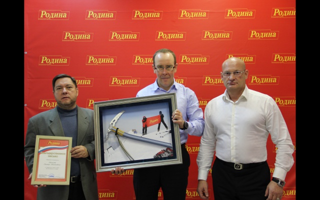 В торжественной обстановке председатель Совета Самарского регионального отделения партии "РОДИНА" Сергей Мирошниченко вручил Леониду Мочалову изготовленный по специальному заказу памятный подарок и благодарственное письмо за продвижение имиджа партии "РОДИНА" при восхождении на Эльбрус.
